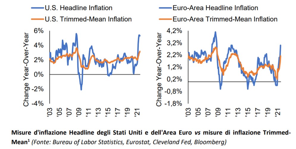 La nostra analisi si basa su indicatori di inflazione che filtrano i fattori di disturbo dell'indice. Non ci riferiamo solo ai popolari, ma grossolani indicatori "ex-alimentare ex-energia", le cosiddette "misure core". È possibile fare di meglio con l'aiuto delle misure cosiddette Trimmed-Mean (le medie sfrondate), che filtrano i prezzi più volatili ogni mese, indipendentemente dalla categoria. Sia negli Stati Uniti sia in Europa, le misure Trimmed-Mean mostrano una ripresa più modesta dell'inflazione dei prezzi al consumo nel 2021. E, secondo la nostra esperienza, queste misure sono più efficaci nell'indicare dove sarà l'inflazione in un anno rispetto alla maggior parte degli altri approcci. Certo, le pressioni sui prezzi potrebbero diventare più ampie, ma non diamo per scontato che sarà così.