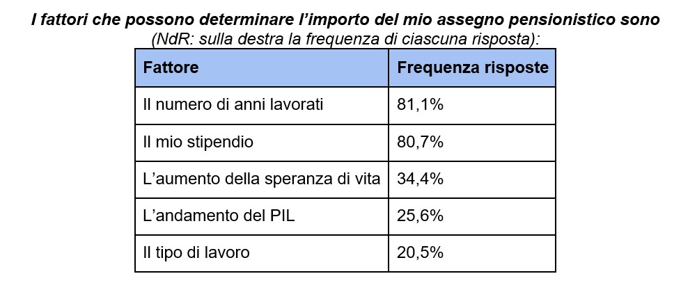 Inoltre, solo l'11% circa ha dimostrato di sapere che il valore dell'assegno pensionistico influenza il momento della pensione (per chi ha iniziato a lavorare dopo il 1996) perché dipende dai contributi versati. Quindi a seconda del livello retributivo e della continuità lavorativa (pause, precarietà, lavoro part-time/stagionale, maternità, cassa integrazione, ecc.) si apre una forbice che può variare dai 64 anni per chi decidesse di anticipare la pensione (pensioni elevate) ai 71 anni (con pensioni basse).