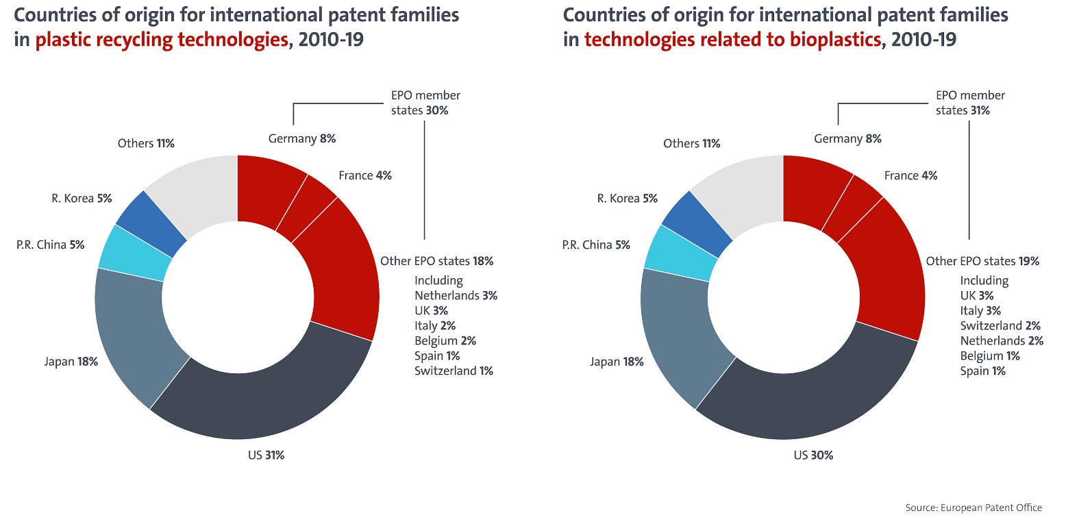 Il rapporto (dal titolo "Brevetti per la plastica di domani: tendenze nell'innovazione globale nel riciclo, nel design circolare e nelle fonti alternative") mostra che tra il 2010 e il 2019 l'Italia ha contribuito con il 9% di tutte le famiglie di brevetti internazionali (IPFs) depositate da aziende e inventori con sede nella UE in entrambe le tecnologie di riciclo della plastica (quarta posizione in Europa) e bioplastiche (terza posizione in Europa). Gli IPFs rappresentano invenzioni di alto valore per le quali sono state depositate domande di brevetto presso due o più uffici brevetti in tutto il mondo.