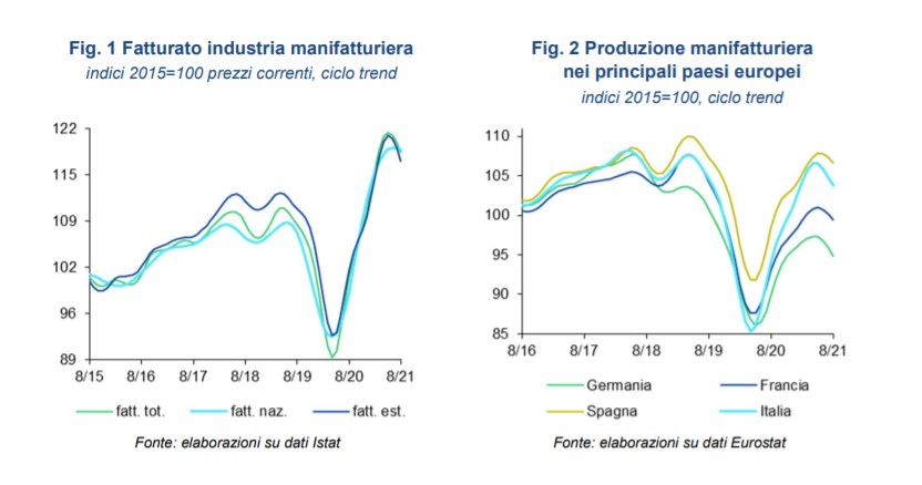 Nei primi otto mesi del 2021 il manifatturiero italiano ha completato il percorso di ripianamento delle perdite accusate ad inizio pandemia. La fase di ripresa proseguirà nei prossimi mesi, consentendo al fatturato di portarsi, a fine anno, su livelli superiori al 2019, sia a prezzi costanti (+0,8%) sia soprattutto a prezzi correnti (+9,3%).