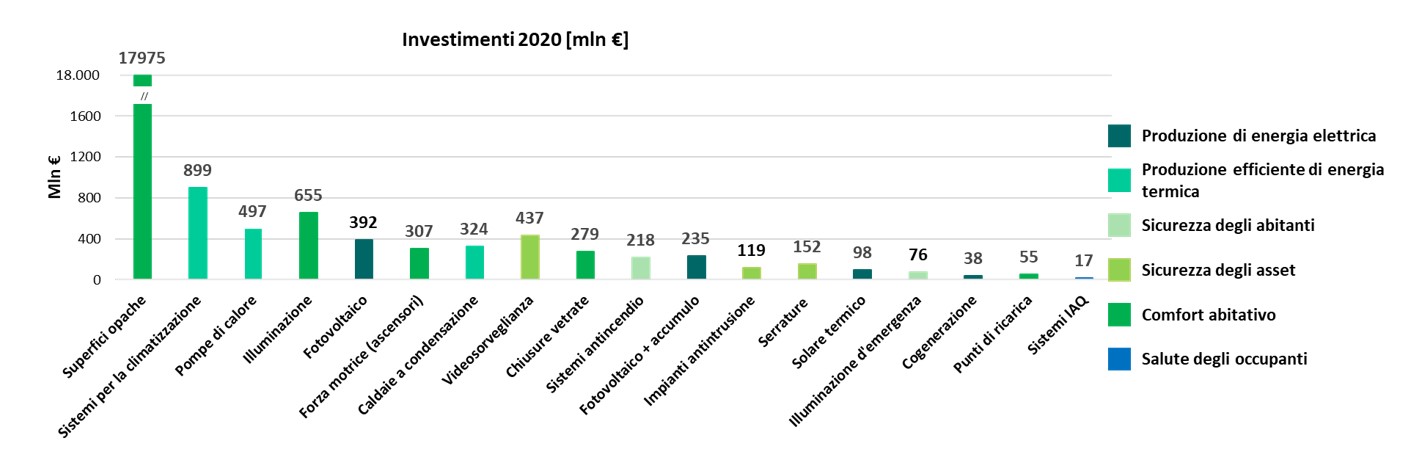Le tematiche di riduzione dei consumi e sostenibilità ambientale continuano a farla da padrone, catalizzando da sole 4,8 miliardi di investimenti in tecnologie per la produzione efficiente di energia elettrica e termica. La spesa per il comfort abitativo si ferma a 1,3 miliardi di euro (27%), quella per la sicurezza degli abitanti e degli asset a 1 miliardo (20%), mentre è ancora marginale, seppur in continua crescita, il contributo delle tecnologie legate alla salute degli occupanti (0,3%). Ci sono poi alcune tecnologie destinate a diffondersi notevolmente nel prossimo futuro, in particolare gli impianti fotovoltaici con sistemi di accumulo (a seguito dell'entrata in vigore della Direttiva RED II), l'illuminazione intelligente e i punti di ricarica privati, che secondo uno scenario moderato di previsioni al 2025 potrebbero raggiungere 11 volte il numero attuale.