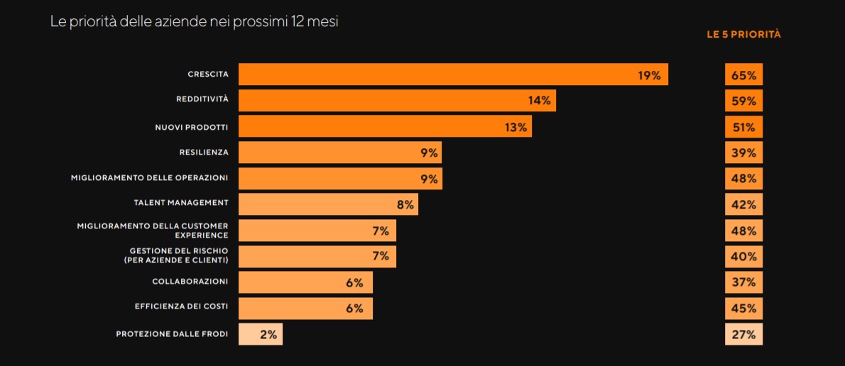 Gli obiettivi chiave del nuovo anno sono per tutti la crescita (45% contro 41% Italia), l'aumento dei profitti (39%), e il lancio di nuovi prodotti, area che vede l'Italia insieme alla Germania superare gli altri Paesi che hanno una media del 34%. Una altra voce molto alta in Italia è quella della resilienza, cruciale per un quarto dei rispondenti, con percentuali molto più basse nel resto dell'Europa.
