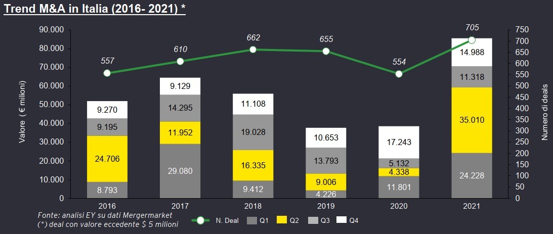 "L'M&A in Italia nel 2021 ha raggiunto un volume complessivo di oltre 85 miliardi di euro, toccando un valore mai registrato prima nel nostro Paese. L'elevata attività transazionale è stata una delle risposte alla trasformazione dei modelli di business e delle operations delle aziende, accelerata dalla pandemia, che ha innescato processi di riorganizzazione supportati anche da acquisizioni per dotarsi di nuove competenze, tecnologie, catene di produzione e mercati di sbocco. Inoltre, una rinnovata attenzione ai temi della sostenibilità, nel senso ampio del termine, ha contribuito a spingere ulteriormente la dinamica transazionale, specie per efficientare l'impatto dai cicli di produzione e per allargare la gamma di prodotti per soddisfare le nuove esigenze dei consumatori", commenta Marco Daviddi, Strategy & Transactions Markets Leader Europe West, EY.