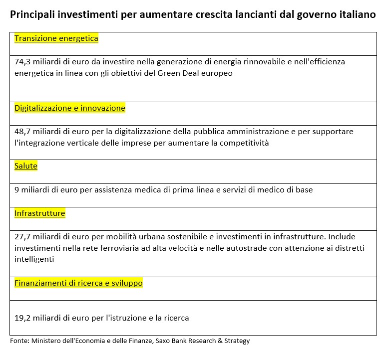 Draghi non ha ancora avuto il tempo di affrontare i problemi strutturali dell'economia italiana. Il rallentamento della produttività è uno di questi. I dati dell'OCSE mostrano che le aziende italiane con meno di 10 dipendenti, che costituiscono una grossa fetta del modello di business italiano, hanno livelli di produttività del lavoro inferiori rispetto a quelle estere. In media, il valore aggiunto per dipendente nelle aziende italiane rispetto alle aziende tedesche è inferiore del 35% in Italia rispetto alla Germania. Alcune possibili cause della scarsa produttività dell'Italia sono il basso livello di spesa per la ricerca (1,4% del PIL nel 2018 contro il 2,4% della media dei Paesi OCSE secondo gli ultimi dati disponibili) unito a investimenti insufficienti in istruzione e al ritardo accumulato l'adozione di nuove tecnologie. Al riguardo, gli investimenti individuati dal governo italiano (vedi tabella), che saranno finanziati dal pacchetto di ripresa Next Generation EU, potrebbero rappresentare una grande opportunità per aumentare la crescita della produttività del lavoro. L'attuazione di questi investimenti richiederà una stabilità politica che solo Draghi può portare, a nostro avviso.