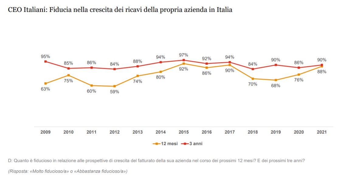 In particolare, i CEO degli USA si mostrano sicuri circa le prospettive di crescita delle proprie aziende; il 40% dichiara infatti di essere certo della crescita dei ricavi nel 2022, opinione condivisa anche dai CEO indiani. I CEO italiani non si discostano da questo clima di fiducia che perdura sia nel breve sia nel medio termine: l'88% degli intervistati è fiducioso circa la crescita nei prossimi 12 mesi, dato in aumento di +12 punti rispetto all'anno scorso, mentre i livelli di fiducia per il triennio arrivano al 90%, guadagnando +4 punti, rispetto alla precedente rilevazione.
