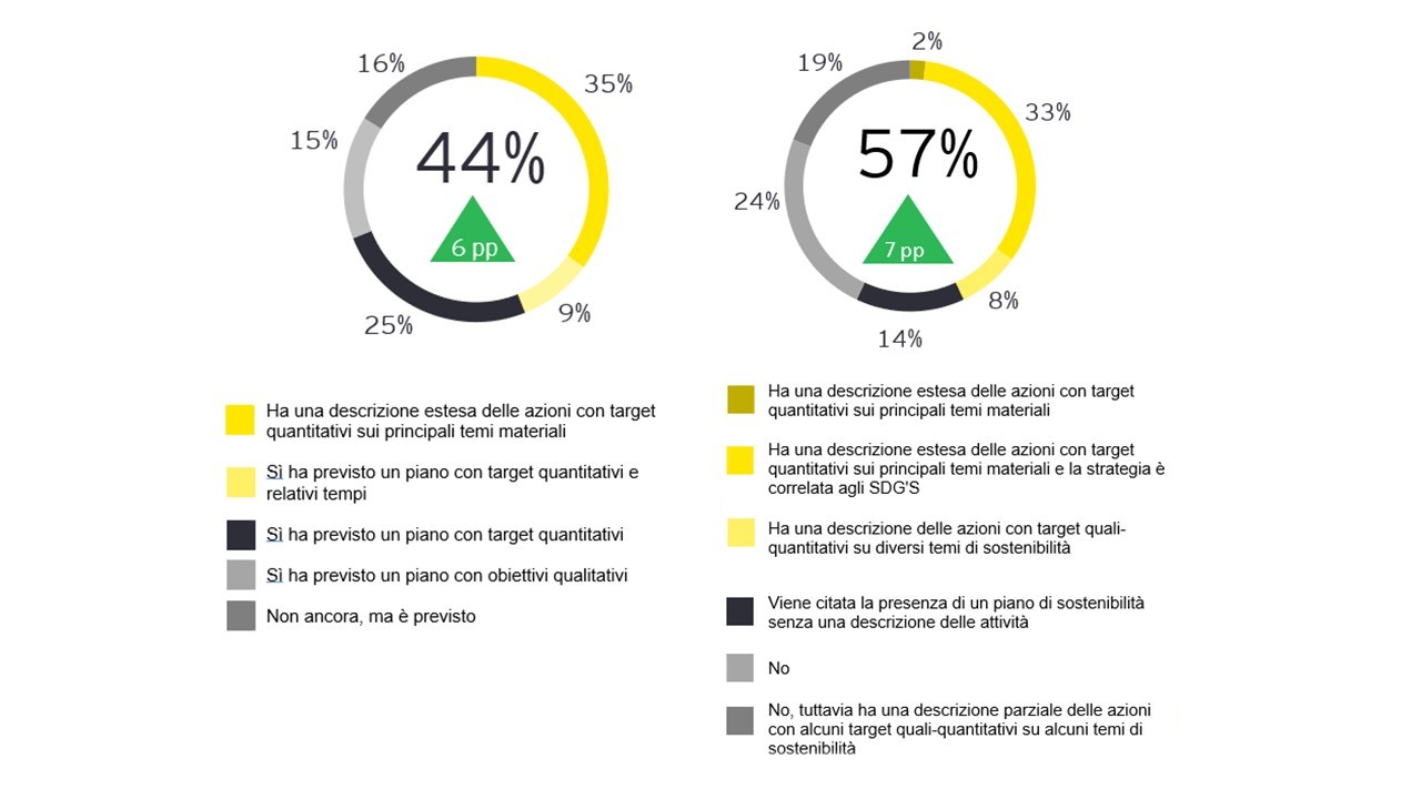 Sulla base dei risultati della survey EY emerge che il 69% delle aziende intervistate abbia previsto un piano di sostenibilità corredato da obiettivi e nel 44% dei casi (aumento del 6% rispetto al 2019 anno pre-pandemico) siano stati formalizzati target quantitativi, mentre appena il 35% delle aziende ha definito anche le relative tempistiche per il raggiungimento degli obiettivi. Il 15% delle società analizzate, che non sono dotate attualmente di un piano di sostenibilità, dichiara di averne previsto lo sviluppo.