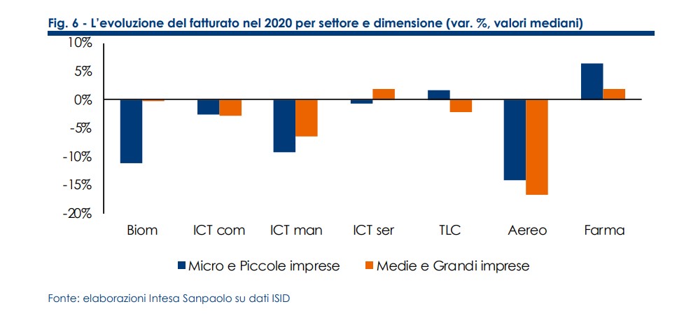 Il dettaglio per specializzazione produttiva evidenzia però una discreta dispersione dei risultati, confermando come la pandemia abbia colpito in maniera più o meno intensa i diversi settori produttivi. Il settore farmaceutico ha chiuso il 2020 in territorio positivo: l'evoluzione del fatturato delle imprese del campione è stata pari a +3,1% (valori mediani), evidenziando il miglior risultato tra i settori ad alta tecnologia analizzati. Il dettaglio dimensionale evidenzia un incremento diffuso, ma in particolare per le piccole e piccolissime imprese, che potrebbero aver beneficiato della maggiore flessibilità produttiva e di mercati di nicchia. Sebbene in calo rispetto al 2019, quando la quota di imprese con fatturato in crescita è risultata pari al 66%, nel 2020 ancora oltre la metà dei soggetti ha registrato un incremento delle vendite.