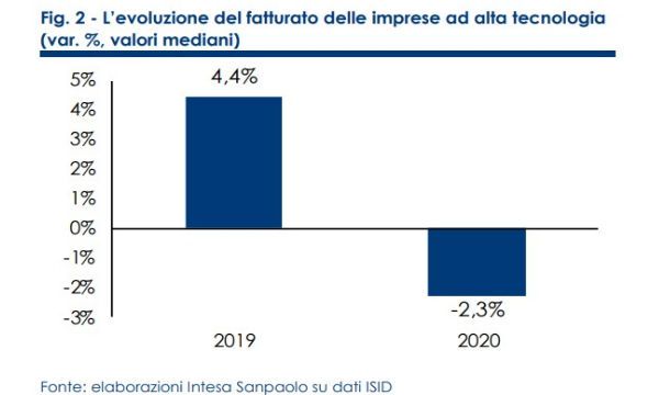 Nel 2020 il fatturato delle imprese dei settori ad alta tecnologia ha evidenziato un calo del 2,3% (valori mediani) dopo il +4,4% del 2019, una contrazione contenuta considerando le chiusure di alcune attività produttive non strategiche imposte durante la fase più acuta della pandemia. Circa il 45% delle imprese ha chiuso il 2020 in territorio positivo, un dato superiore al 30% che emerge considerando un campione di oltre 146mila imprese, selezionato utilizzando le stesse soglie fatturato e che include anche le imprese specializzate in settori a bassa e media tecnologia. In un conteso di difficoltà, con una contrazione del PIL italiano del 9% e un calo del fatturato dell'industria manifatturiera del 9,4% (variazione a prezzi correnti), i settori ad alta tecnologia evidenziano performance economiche meno negative. La specializzazione in settori che hanno risentito meno del crollo della domanda e delle chiusure ha permesso di registrare un calo del giro di affari più contenuto rispetto al panorama italiano.