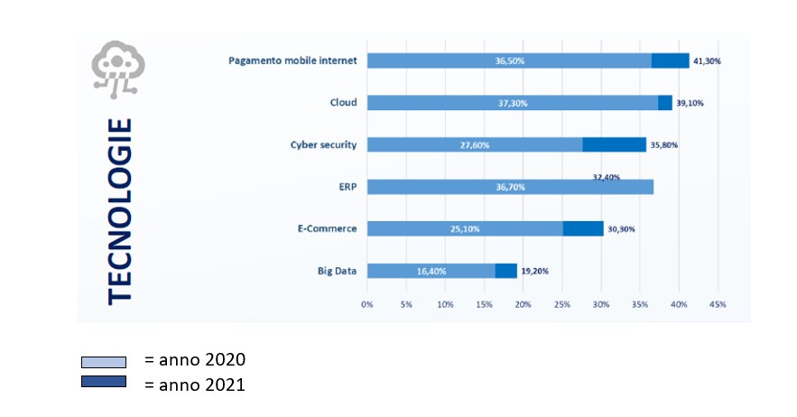 Tra le tecnologie abilitanti per restare operativi anche da remoto, adottate dalle imprese, la più diffusa è stata quella relativa ai "pagamenti mobili attraverso internet" (utilizzata oggi dal 41,3% delle imprese) che nel 2020 si collocava al 3° posto; al secondo posto segue il Cloud - al 1° posto nel 2020 - (pari al 39,1%) e al terzo posto la cybersecurity - 4° posto nel 2020 - crescendo progressivamente di importanza (pari al 35,8% degli utilizzi).Rispetto al 2018, le imprese che utilizzano il Cloud e i pagamenti elettronici sono aumentate di 8 punti percentuali; quelle che si avvalgono di strumenti di cybersecurity e che hanno avviato un e-commerce di 9 punti.