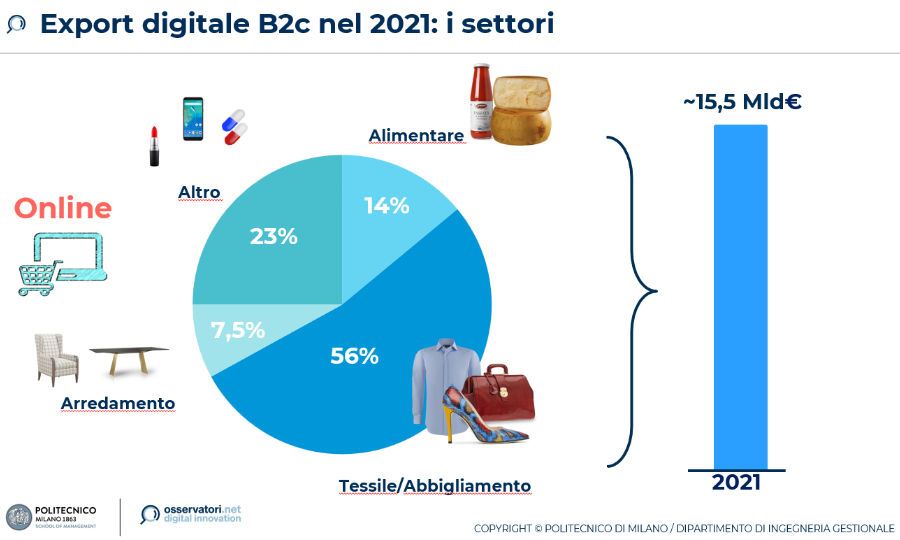 Secondo la ricerca dell'Osservatorio Export Digitale della School of Management del Politecnico di Milano, il settore più importante, pari al 56% del mercato complessivo dell'export digitale B2c e B2b2c, si conferma il fashion, con un valore di 8,6 miliardi di euro nel 2021, +20% sul 2020, superando i valori pre-Covid. Il secondo settore è il food & beverage, con un export online di 2,2 miliardi di euro, 14% del totale, che prosegue la crescita (+10%), ma rallenta dopo l'exploit 2020 (+46%). Il terzo comparto è l'arredamento, 1,2 miliardi di euro (+12%), pari al 7% del totale delle esportazioni online di beni di consumo. Elettronica, cosmetica, cartoleria, giochi, articoli sportivi e gli altri comparti valgono complessivamente il 23% dell'export digitale B2c, ma singolarmente hanno un peso marginale.