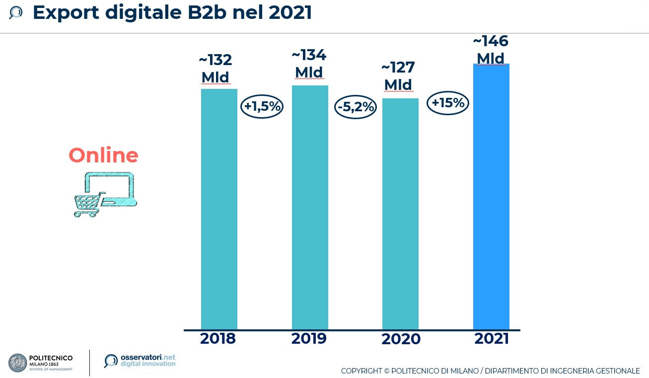 Invece, l'export digitale B2B (tramite cioè canali digitali come EDI o Web EDI, Extranet, Marketplace) nel 2021 ha raggiunto un valore di 146 miliardi di euro, anche questo in crescita del 15% rispetto al 2020 e con un peso del 28,3% sull'export complessivo di prodotti. Con l'eccezione del settore farmaceutico, in forte flessione dopo il boom del 2020, per tutti i settori B2b l'export online è cresciuto in modo importante ed è tornato al di sopra dei livelli pre-Covid (nel 2019 il valore era di 134 miliardi).