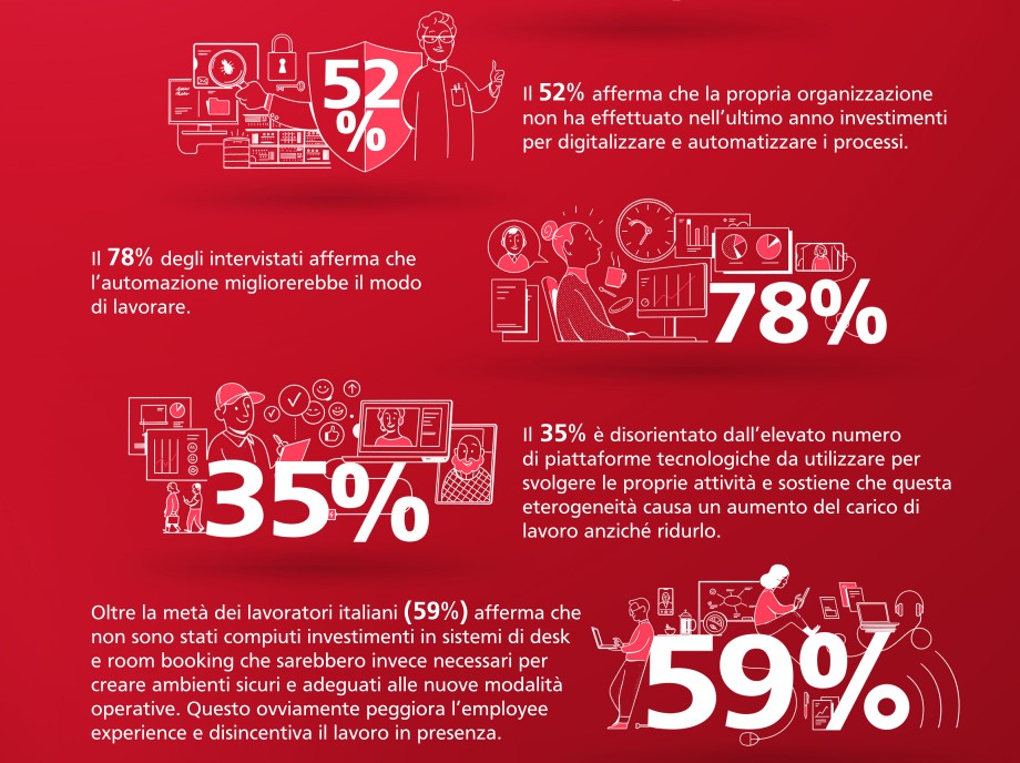 Condotto su un panel di 500 lavoratori italiani è emerso come le imprese del nostro Paese non stanno cogliendo i vantaggi connessi all'automazione dei flussi di lavoro e all'utilizzo di soluzioni per la gestione degli spazi.