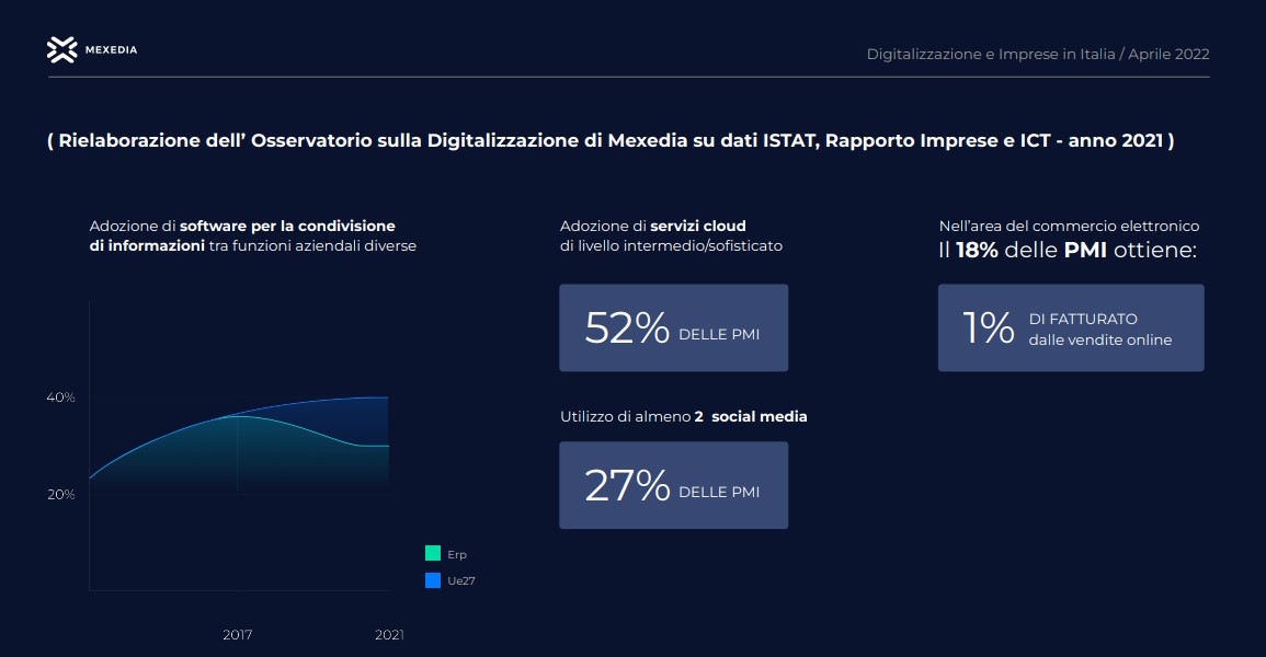 I dati dello studio di Mexedia si devono leggere alla luce di quanto rilevato dall'ISTAT sulla diffusione della digitalizzazione nelle imprese e riportato nella nota "Imprese e ICT - anno 2021" diffusa a gennaio scorso.