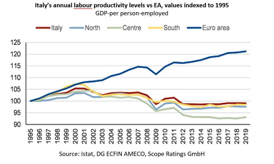 Secondo l'agenzia di rating Scope la produttività del lavoro italiana è peggiorata negli ultimi 20 anni, rimanendo costantemente al di sotto della media dell'eurozona; il che mette in dubbio il realismo degli obiettivi di crescita media assunti a lungo termine