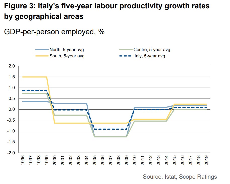 "Il divario nord-sud del PIL per occupato è passato da 17,5 euro nel 1995 a 20,1 euro nel 2019, mentre anche il divario centro-nord è aumentato da 5,1 euro a 8,2 euro", afferma Giulia Branz, analista di Scope. "Criticamente, questo divario in aumento non è dovuto al fatto che il nord ha migliorato i suoi livelli di produttività, ma piuttosto al calo della produttività nel resto d'Italia".