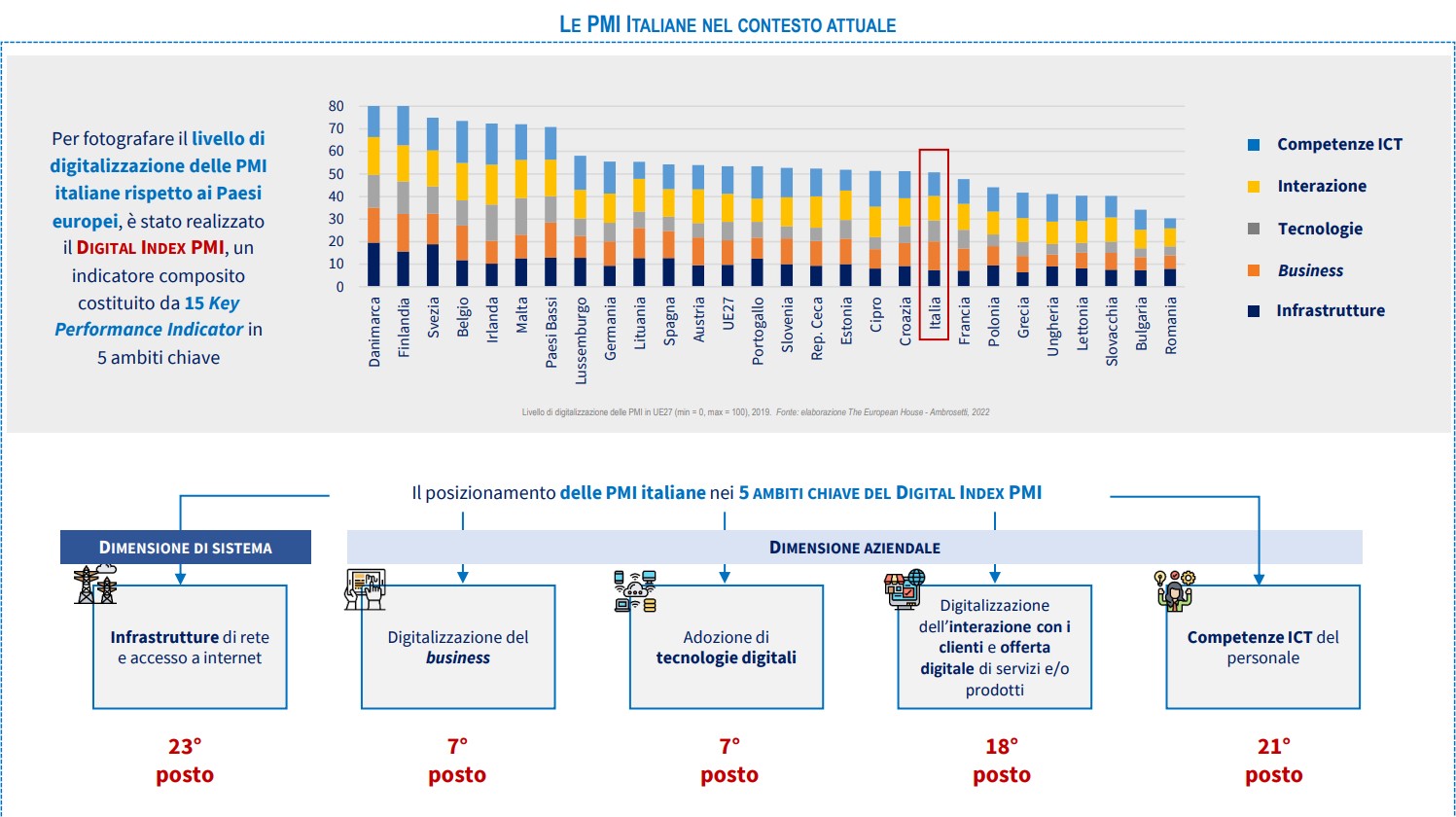 L'Italia, infatti, sconta un forte ritardo sul digitale rispetto ai Paesi UE, attestandosi al 20° posto dell'Indice DESI stilato dalla Commissione Europea per misurare il livello di digitalizzazione dei 27 Stati membri. Il Belpaese, nello specifico, è ultimo in Europa per numero di laureati in ambito ICT (circa 4mila all'anno, pari all'1,3% del totale). Un gap che potrebbe essere colmato se le oltre 375 mila PMI italiane, che costituiscono un volano di crescita per il nostro Paese, accelerassero il loro processo di digitalizzazione. Le piccole e medie imprese, infatti, da sole generano 2.834 miliardi di euro di fatturato, pari al 42% di quello totale registrato dalle imprese italiane, contribuiscono al 41% del PIL del nostro Paese, a oltre un terzo (35%) degli investimenti e a quasi la metà (48%) dell'export totale.