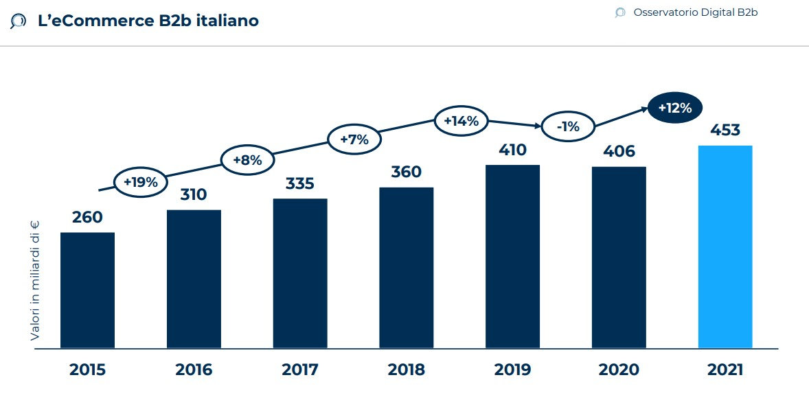 Sette imprese italiane su dieci (tra grandi realtà e PMI) hanno intenzione di investire in questo ambito, ma appena il 17% investe una quota significativa del proprio fatturato, tra il 2% e il 5%. L'eCommerce B2B, inteso come il valore delle transazioni in cui l'ordine viene scambiato in formato digitale, ha raggiunto nel 2021 453 miliardi di euro, +12% rispetto al 2020, pari al 21% delle transazioni B2B totali italiane. Dopo l'anno della pandemia, l'indicatore riprende a crescere in valore assoluto e aumenta dell'1% la sua incidenza sul fatturato italiano complessivo.