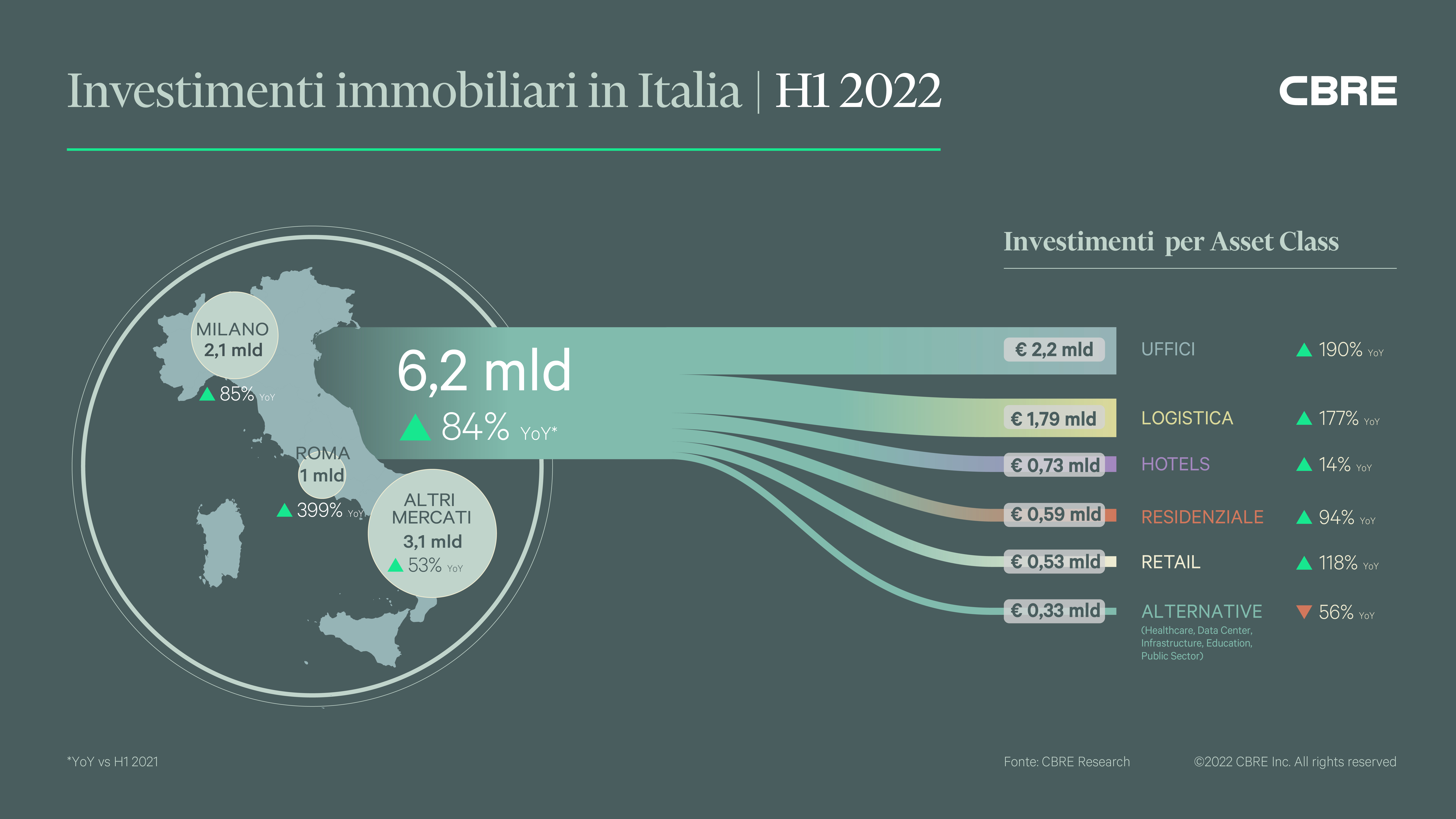 Il volume degli investimenti nel Commercial Real Estate in Italia, nei primi sei mesi del 2022, è pari a 6,2 miliardi di euro, in crescita dell'84% rispetto allo stesso semestre del 2021 (3,4 miliardi di euro). Su base storica, è il primo semestre migliore di sempre.