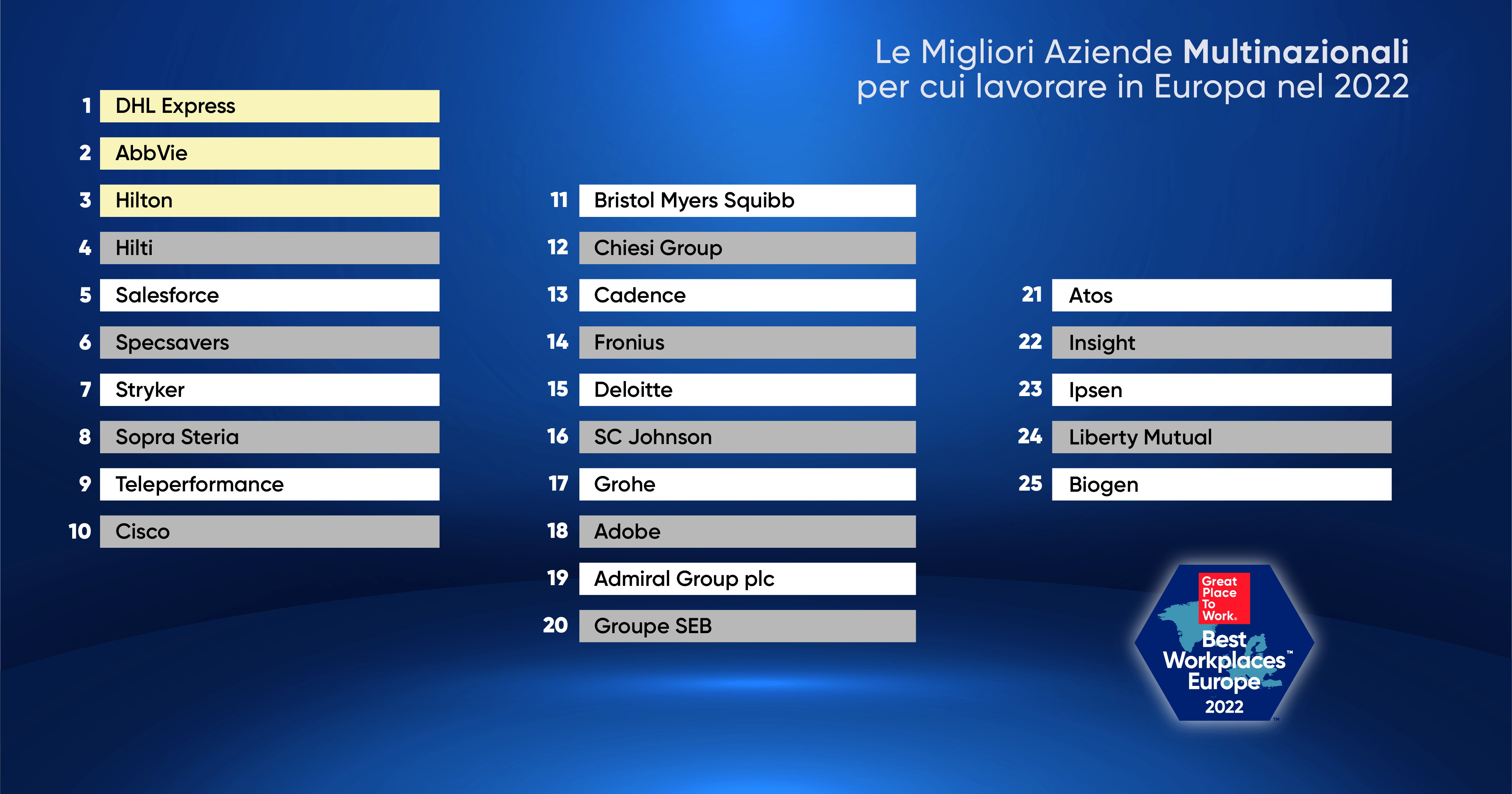 La classifica legata alla categoria Multinational Companies, che comprende le migliori 25 aziende europee operanti in tre o più paesi del mondo e con più di 1.000 dipendenti, vede al primo posto DHL Express, multinazionale attiva nel settore logistica e trasporti. Seguono AbbVie (2°), realtà attiva nel settore biotecnologie e prodotti farmaceutici e, in terza posizione, Hilton, catena globale attiva nell'ambito dell'ospitalità, hotel e resort. Il podio della categoria 50 Large Companies, imprese europee con un numero di collaboratori superiore a 500, è composto da Turkcell Global Bilgi, azienda turca operante nel settore delle telecomunicazioni, seguita dalla polacca Sii Polska (Information Technology) e dalla svizzera Vebego AG (servizi professionali). Tra le imprese europee costituite da un numero di persone compreso tra 50 e 499 e appartenenti alla categoria 50 Best Medium troviamo al primo posto la svizzera UMB AG (Information Technology) davanti all'azienda cipriota XM (servizi finanziari e assicurazioni) e alla belga Easi (Information Technology). Infine, tra le 25 migliori aziende europee della categoria Best Small, con un numero di collaboratori compreso tra 10 e 49, trionfa l'irlandese Global (media) davanti all'impresa turca Latro Kimya (manifatturiero e produzione) e alla greca NetSteps (servizi professionali).