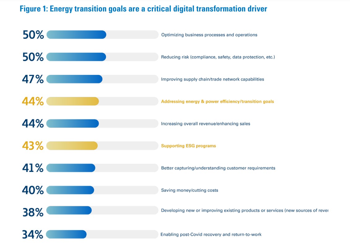 Le aziende del settore industriale hanno concentrato gli sforzi in termini di digitalizzazione guardando a una delle criticità tipiche del settore: la mancanza di operatori specializzati. In tale contesto, l'impegno digitale per la transizione energetica risulta in ritardo. Solo il 24% delle aziende del settore industriale ritiene energia ed elettricità fondamentali per la trasformazione industriale. Le aziende che applicheranno la digitalizzazione alla transizione energetica otterranno vantaggi cruciali per conservare o ottenere un vantaggio competitivo. In Italia, Paese tradizionalmente legato al settore manifatturiero, le priorità per la maggior parte delle aziende restano l'ottimizzazione dei processi (54%) e la riduzione dei rischi (51%).