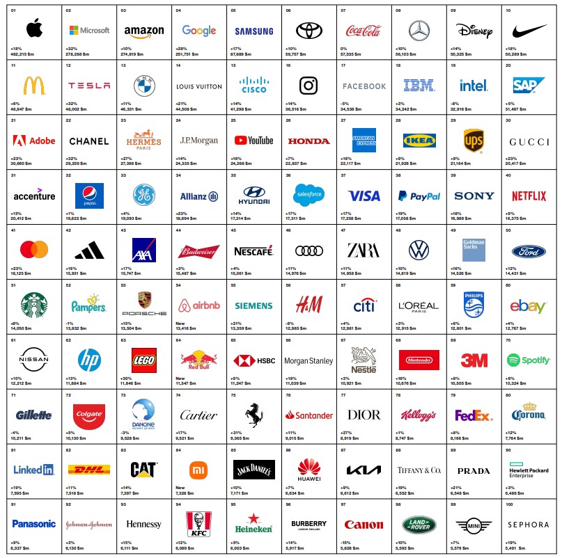 Con un aumento del valore del brand del 18%, Apple (482,215 miliardi di dollari) rimane in testa alla classifica, seguito da Microsoft (278,288 miliardi) che scavalca Amazon (274,819 miliardi), terzo. Google (251,751 miliardi) si riconferma in quarta posizione.