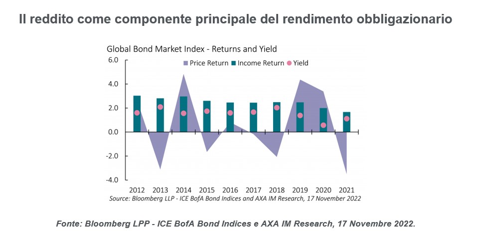 Gli investitori obbligazionari possono però essere tra i principali beneficiari del picco inflazionistico e dei tassi di interesse. Per i mercati obbligazionari, il profilo di rischio e rendimento è migliorato. I rendimenti sono saliti, rispetto agli ultimi anni, e ciò offre più "carry" agli obbligazionisti e migliori opportunità di reddito per i nuovi investimenti nel reddito fisso. Nel contempo, a fronte del rialzo degli yield, il reddito fisso può avere un ruolo più rilevante nei portafogli multi-asset. Nel 2022, insolitamente, i rendimenti sia azionari che obbligazionari sono stati negativi, ma se i mercati azionari faticano sul fronte della crescita, le obbligazioni possono offrire una copertura e un'alternativa per gli investitori orientati al reddito.