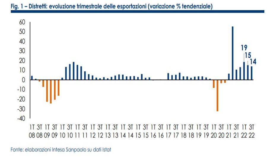 Nel terzo trimestre del 2022 l'export dei distretti industriali ha registrato un aumento tendenziale del 14%. E' il sesto aumento consecutivo a doppia cifra. Nel complesso, nei primi nove mesi dell'anno le esportazioni sono salite del +15,9%. E' stata superata la soglia dei 110 miliardi di euro (a quota 113,4 miliardi), il 19,6% in più rispetto ai primi nove mesi del 2019 quando l'export distrettuale fu pari a poco meno di 95 miliardi. E' quanto emerge dal "Monitor nazionale dei distretti" a cura di Giovanni Foresti e Romina Galleri, economisti della Direzione Studi e Ricerche di Intesa Sanpaolo.