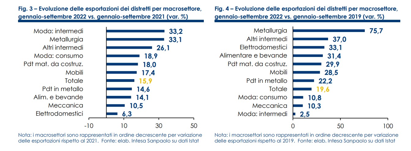 Tra i migliori distretti per aumento dell'export (in valore) rispetto ai primi nove mesi 2019 sono presenti: la filiera Metalmeccanica con i Metalli di Brescia, la Meccatronica di Reggio Emilia, la Metalmeccanica di Lecco, la Termomeccanica di Padova; il Sistema Moda con l'Oreficeria di Arezzo e di Vicenza, l'Occhialeria di Belluno, la Pelletteria e le calzature di Firenze, il Tessile e abbigliamento di Prato, la Calzatura sportiva e sportsystem di Montebelluna, l'Abbigliamento di Empoli, l' Abbigliamento-tessile gallaratese; il Sistema casa con le Piastrelle di Sassuolo, i Rubinetti, le valvole e il pentolame di Lumezzane, il Mobile e pannelli di Pordenone e il Legno e arredo della Brianza. All'interno della filiera Agro-alimentare i risultati di maggior crescita delle esportazioni sono stati ottenuti dall'Alimentare di Parma, dalle Conserve di Nocera, dal Prosecco di Conegliano-Valdobbiadene, dal Lattiero-caseario della Lombardia sud-orientale, dall'Alimentare napoletano, dall'Ortofrutta del barese e dall'Olio toscano.