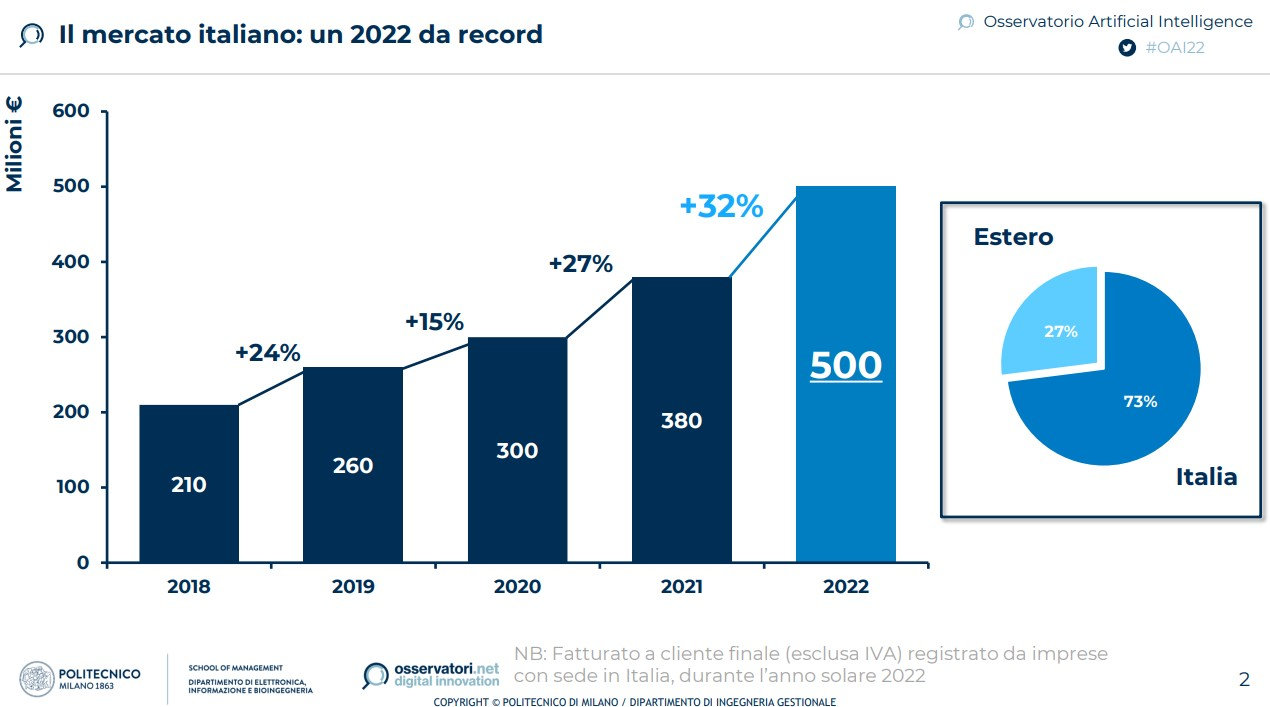 In Italia, il mercato dell'AI nel 2022 ha raggiunto 500 milioni di euro, con una crescita di ben il 32% in un solo anno, di cui il 73% commissionato da imprese italiane (365 milioni di euro) e il 27% rappresentato da export di progetti (135 milioni di euro).