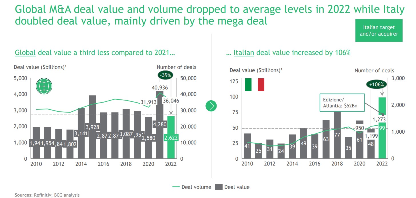 "Nel 2022 - spiega Edoardo Palmisani, Managing Director e Partner di BCG - l'M&A in Italia ha visto raddoppiare il valore delle transazioni anno su anno. Il dato tuttavia è influenzato da alcune transazioni di dimensioni significative che da sole hanno rappresentato più del 50% del valore complessivo delle operazioni".