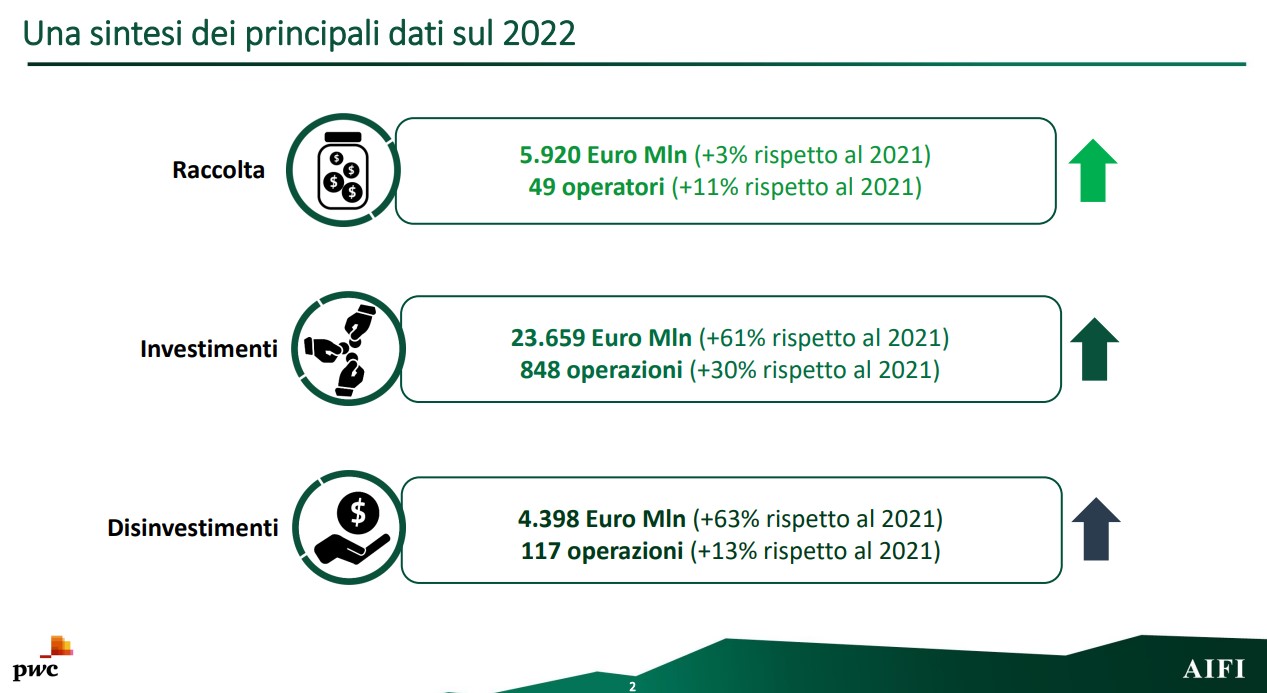 Nel 2022 l'ammontare disinvestito al costo di acquisto delle partecipazioni è stato pari a 4.398 milioni di euro, in crescita del 63% rispetto ai 2.702 milioni dell'anno precedente. Il numero di exit è stato pari a 117, +13% rispetto alle 104 del 2021.