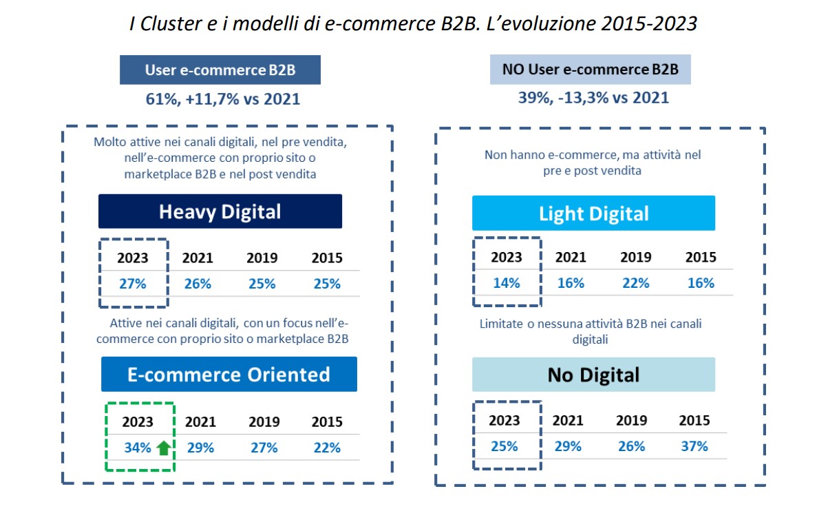 Le aziende che hanno già attivato in modo strutturato processi e servizi per i canali digitali sono il 27% e possono essere definite "Heavy Digital", in quanto il loro processo di digitalizzazione ha già toccato tutte le fasi canoniche, con particolare attenzione al pre-vendita orientato al marketing, alle vendite tramite sito diretto e al post-vendita. Si tratta di realtà pienamente convinte dell'impatto positivo del processo di digitalizzazione sul proprio business, in particolare per lo sviluppo del brand e per la ricerca di nuovi stakeholder: più in generale, sostengono l'utilità della digitalizzazione trasversalmente a tutti gli obiettivi e gli ambiti commerciali. Per tale motivo, continueranno a investire in questa direzione anche nel prossimo futuro, soprattutto in servizi di formazione e consulenza, ma anche nello sviluppo del sito eCommerce e dei contenuti per i canali digitali.