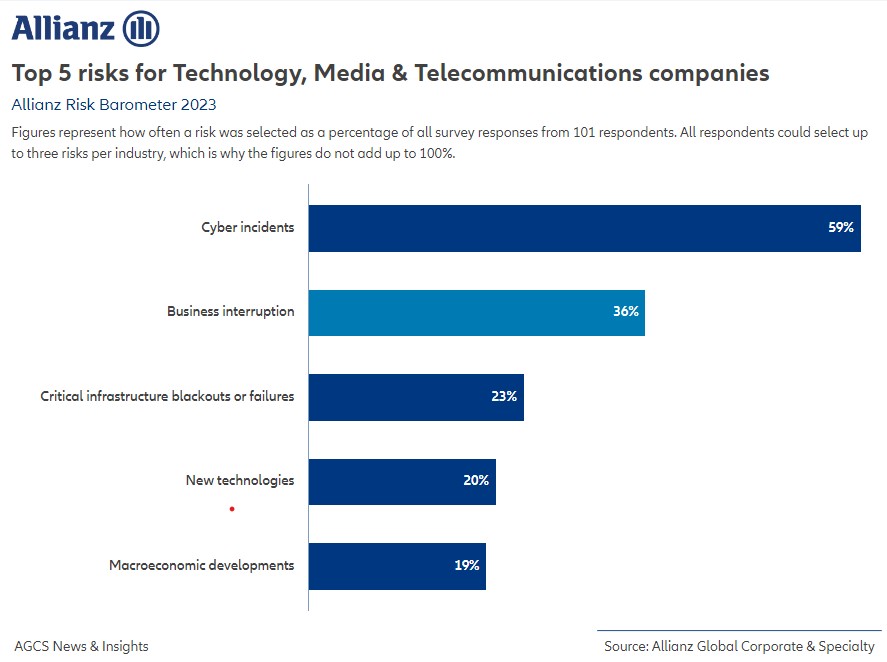 Incidenti informatici, interruzione dell'attività e guasti alle infrastrutture critiche sono i rischi principali per le aziende del settore Technology, Media and Telecommunications (TMT), secondo gli intervistati dell'Allianz Risk Barometer per questo settore. Dopo il lancio dei principali rischi aziendali globali nell'Allianz Risk Barometer 2023 a gennaio, Allianz Global Corporate & Specialty (AGCS) ha ora pubblicato il suo Global Industry Solutions TMT Outlook, uno dei numerosi briefing sulle tendenze del rischio per specifici settori industriali, tra cui l'edilizia e i servizi finanziari.