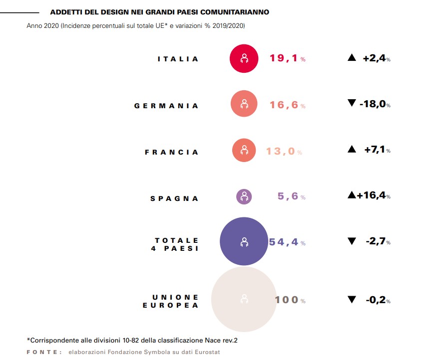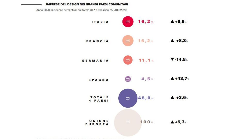 Secondo uno studio di Fondazione Symbola, Deloitte Private e Poli.Design, l'Italia è il Paese dell'UE con il maggior numero di imprese in ambito design (36 mila), che offrono occupazione a 63 mila lavoratori e generano un valore aggiunto pari a 2,94 mld