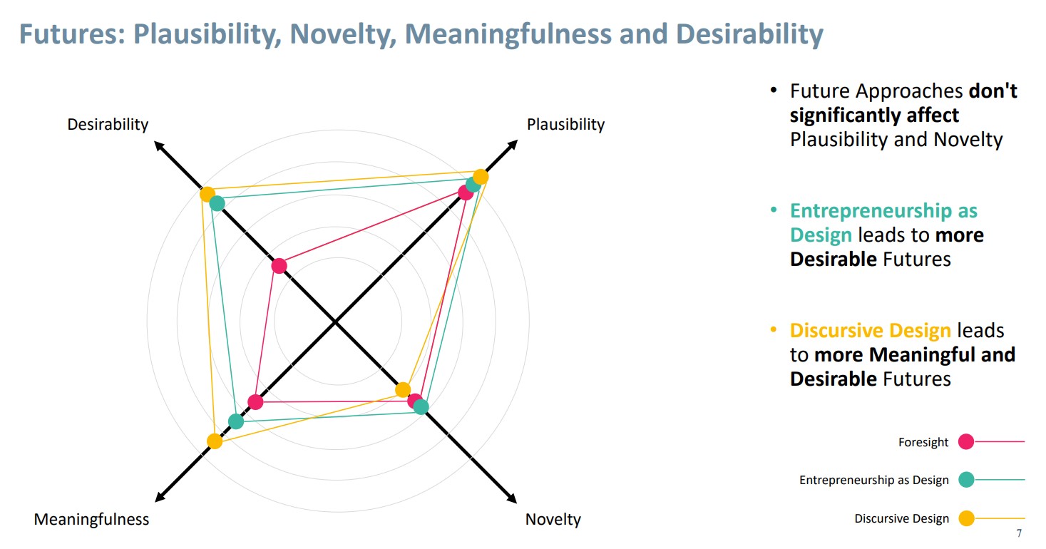 Gli scenari futuri generati dai team che hanno seguito un processo di Foresight sono caratterizzati da valori alti di plausibilità, valori medi di novità, valori medi di significatività e valori medio-bassi di desiderabilità. Gli scenari futuri generati dai team che hanno seguito un processo di Entrepreneurship as Design sono caratterizzati da valori alti di plausibilità, valori medi di novità, valori medio-alti di significatività e valori alti di desiderabilità. Gli scenari futuri generati dai team che hanno seguito un processo di Discursive Design sono caratterizzati da alti valori di plausibilità, valori medio-bassi di novità, alti valori di significatività e alti valori di desiderabilità. La maggiore differenza nei tre approcci di futuro si osserva quindi nella dimensione della Significatività e della Desiderabilità, che sono più alte per l'Entrepreneurship as Design e il Discursive design rispetto al Foresight. Dall'altro lato, il grado di plausibilità presenta valori uguali nei tre approcci futuri.