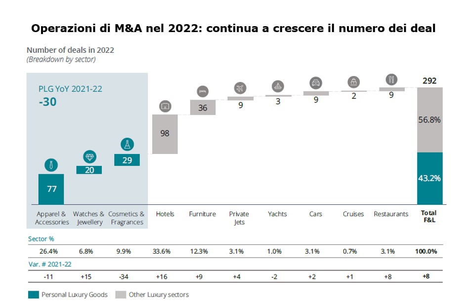 Il settore Fashion & Luxury si è confermato terreno fertile per operazioni di M&A. Rispetto all'anno precedente, infatti, si è registrato un ulteriore aumento nel numero delle transazioni (+8), che si sono attestate a 292 nel solo 2022. Il segmento dei Personal Luxury Goods, nonostante una diminuzione del -30% rispetto all'anno precedente, costituisce comunque il 43,2% circa di tutte le operazioni. La crescita registrata è dovuta principalmente alle performance registrate dal settore alberghiero, con un aumento di 16 operazioni e all'arredamento che segna 9 transazioni in più rispetto all'anno prima.