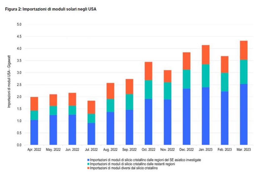 I dati indicano, inoltre, che le importazioni di pannelli fotovoltaici stanno aumentando in seguito all'applicazione di una moratoria di due anni sulle nuove tariffe doganali. Nel giugno 2022, il presidente Biden ha emesso un ordine esecutivo volto a bloccare l'attuazione di qualsiasi nuova tariffa sul solare per un biennio. Nei mesi successivi le importazioni dai Paesi colpiti dalle restrizioni sono aumentate, chiudendo il 2022 ai massimi pluriennali. Le importazioni mensili erano scese al di sotto dei 2 GW prima della moratoria, ma sono salite a oltre 4 GW nel 2023, con la maggior parte dell'aumento determinato dai Paesi colpiti dalle tariffe nel Sud-Est asiatico. Questo ritmo di afflussi suggerisce che i costruttori potrebbero star facendo scorta di pannelli in previsione di una crescita accelerata delle installazioni su scala industriale nella seconda metà del 2023 in poi.