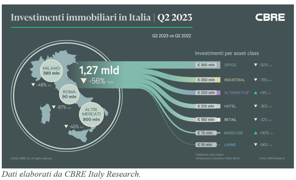 I volumi di investimento nel Commercial Real Estate nel secondo trimestre del 2023 sono stati pari a 1,27 miliardi di euro, in forte crescita rispetto al precedente trimestre (+35%), seppur in calo del 56% rispetto allo stesso periodo del 2022. Questo risultato, analogamente a quanto osservato nel resto d'Europa, è stato causato da un ulteriore aumento del costo del capitale, in seguito alle politiche monetarie della BCE per contrastare l'inflazione, determinando così strategie di repricing trasversali a tutti i settori, con conseguenze negative sulla disponibilità e il costo del debito.
