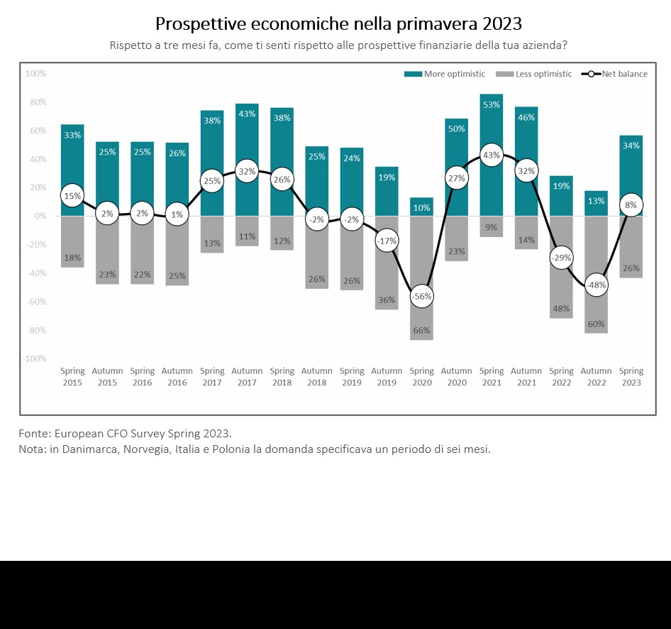 La fiducia delle imprese in Europa è molto migliorata e le aziende europee sono meno preoccupate riguardo ai rischi legati alla crisi energetica e all'inflazione che, nella precedente edizione della Survey, facevano temere il peggio. Oggi, con un saldo netto del +8% (56 punti percentuali in più rispetto all'edizione autunnale della survey) i CFO europei possono essere definiti come cautamente ottimisti. In particolare, il 34% dei CFO intervistati si sente più ottimista rispetto a sei mesi fa sulle prospettive finanziarie della propria azienda: 21 punti percentuali in più rispetto a settembre 2022.