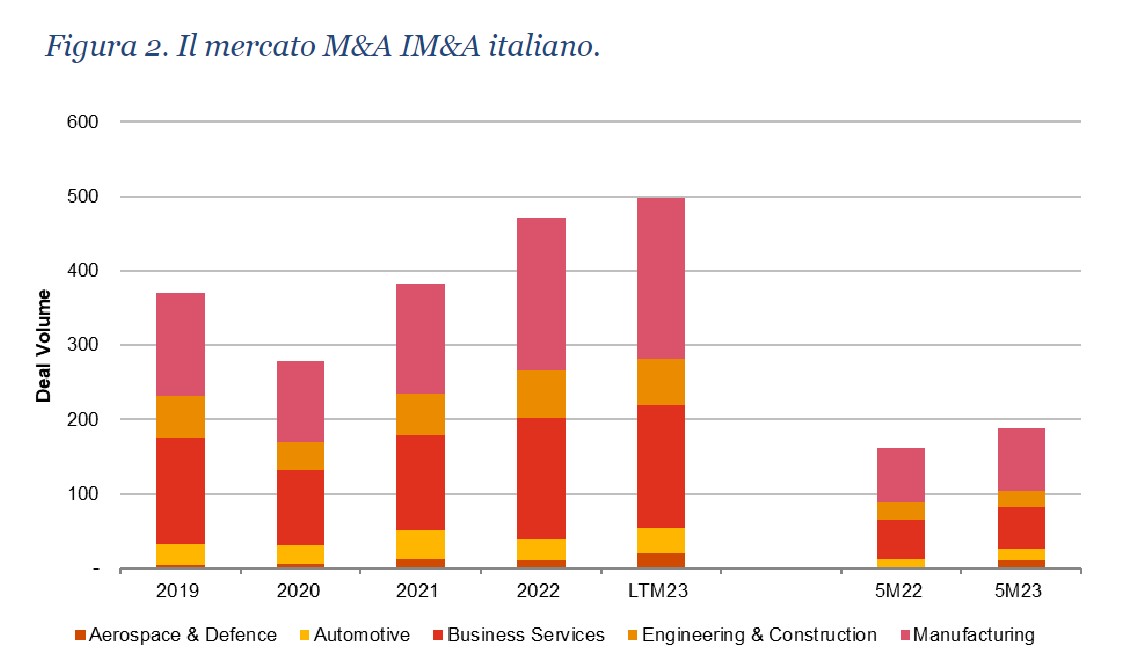 A livello di volumi, il settore manifatturiero continua a dominare il mercato M&A italiano con 84 deals nei primi mesi del 2023, seguito dal comparto Business Services (56 operazioni).