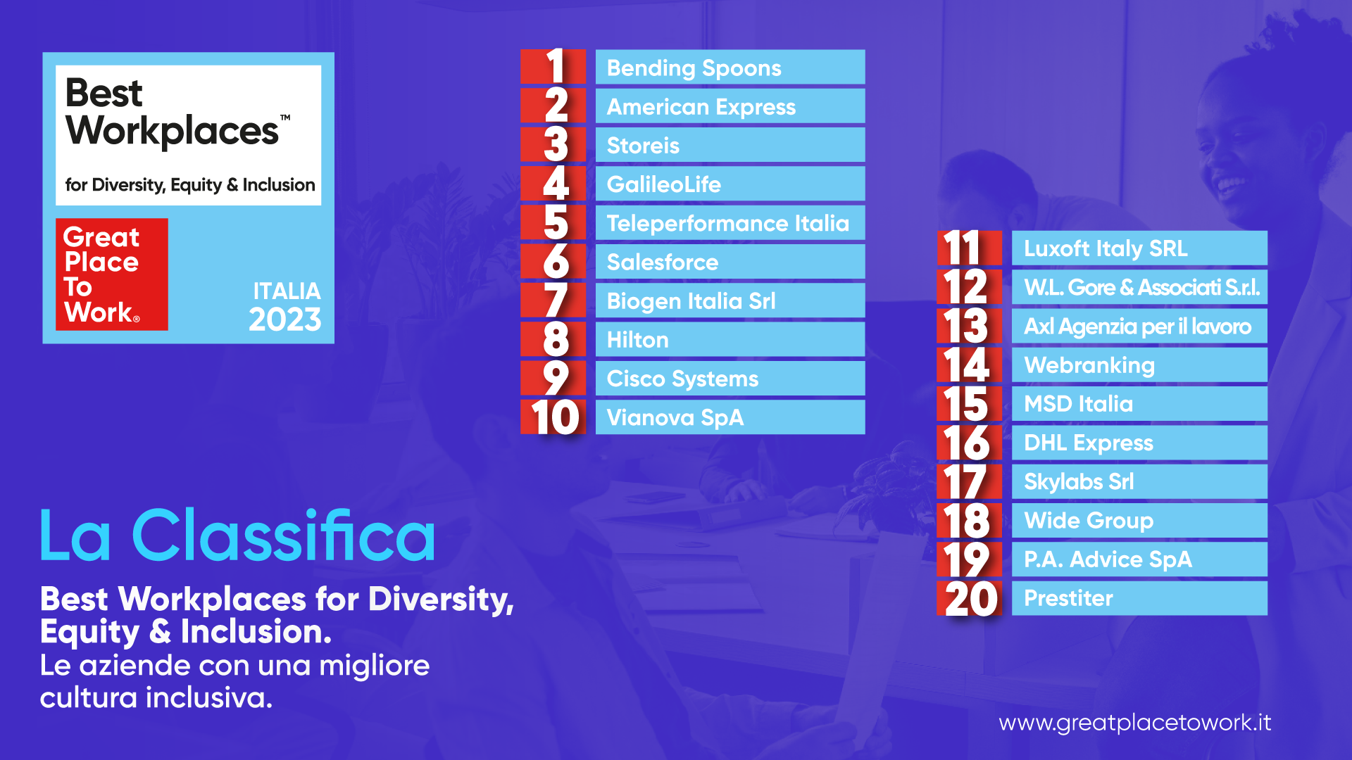 Leadership efficace, condivisione di valori significativi e solidi rapporti di fiducia instaurati dal management con tutti i dipendenti. Sono queste alcune delle caratteristiche principali in grado di migliorare la cultura aziendale in termini di Diversity, Equity & Inclusion (DE&I), massimizzando così il potenziale umano con effetti diretti su sviluppo, innovazione e crescita finanziaria di un'organizzazione. È quanto emerge dalla 2? edizione della classifica, stilata da Great Place to Work Italia, dei "Best Workplaces for Diversity, Equity & Inclusion" ovvero le 20 migliori aziende italiane in grado di offrire ai collaboratori un'esperienza lavorativa capace di sviluppare al meglio il potenziale di ognuno, scelte dalle opinioni espresse da oltre 56mila persone di 131 imprese del Bel Paese con almeno 50 dipendenti.