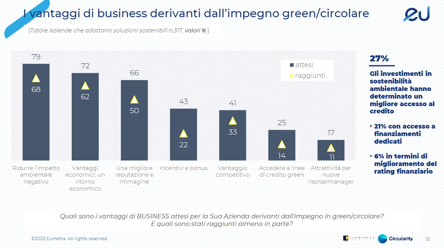 Dai risultati emerge che sempre più aziende italiane e il loro management conoscono le applicazioni dell'economia circolare e si dimostrano molto sensibili a riguardo: nell'edizione 2023 dell'Osservatorio CleanTech il 62% delle imprese dichiara di conoscere bene il concetto di economia circolare, un deciso progresso rispetto al 41% dello scorso anno. Gli intervistati dichiarano inoltre di aver acquisito una maggiore consapevolezza sui vantaggi concreti che gli investimenti in progetti di sostenibilità possono portare, anche dal punto di vista industriale. Come emerge dai dati raccolti dall'indagine, infatti, il 62% delle aziende italiane, quasi 2 su 3, dichiara che gli investimenti nella sostenibilità e nell'economia circolare hanno generato un maggiore ritorno economico. Non solo: il 50% delle aziende intervistate dichiara di aver migliorato la propria reputazione e il 33% aggiunge di aver ottenuto anche un vantaggio competitivo rispetto ai competitor. Un impegno crescente negli ultimi anni quello sui temi dell'economia circolare che il tessuto industriale italiano non vuole diminuire in futuro: quasi la metà delle aziende italiane, il 44%, ha infatti intenzione di investire ancora di più in progetti di sostenibilità nei prossimi anni, mentre il 37% dichiara che investirà di più in progetti di economia circolare.