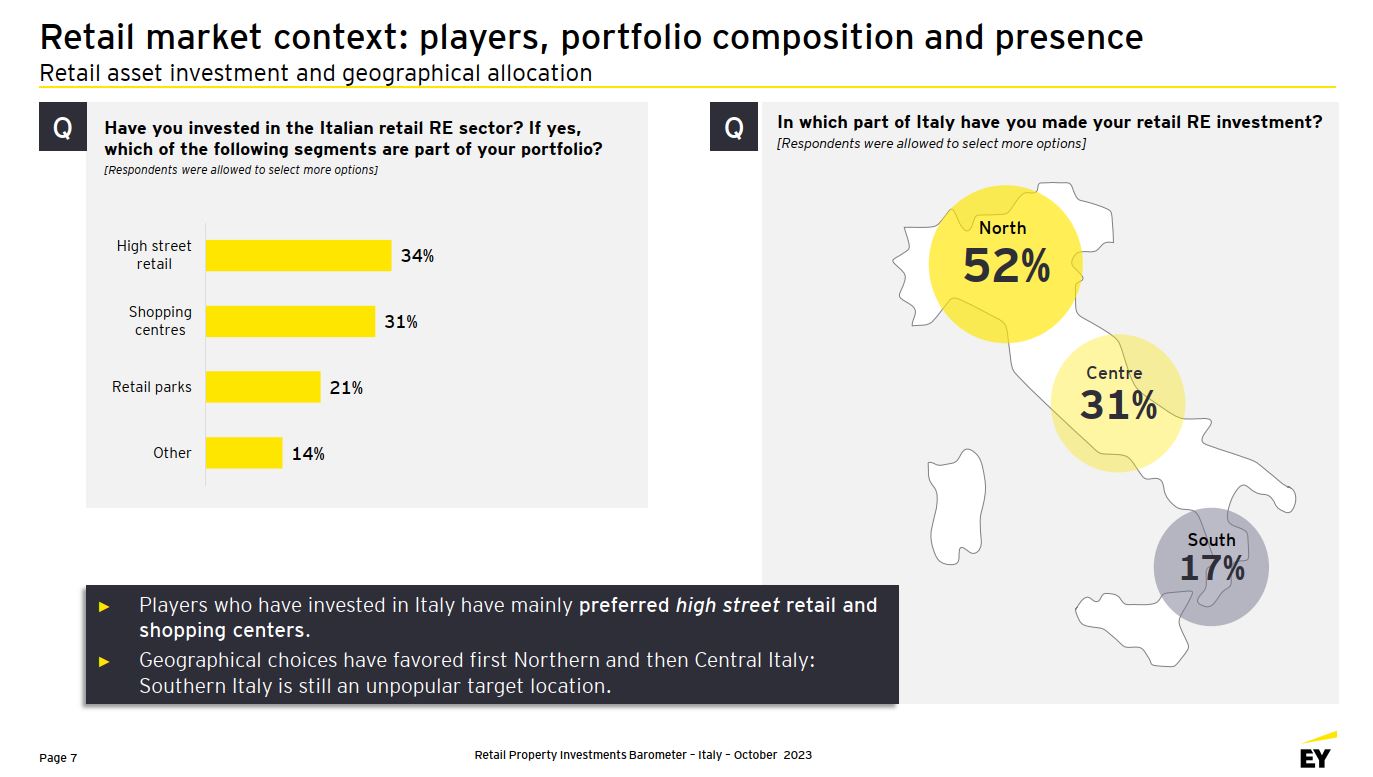 Oltre il 90% dei manager intervistati ha investimenti nel comparto retail, l'80% dei quali ha destinato all'Italia una porzione della relativa allocazione; di questi, circa il 40% ha investimenti superiori a 200 milioni di euro, principalmente nell'high street e nei centri commerciali, in prevalenza situati nel Nord e Centro Italia. È quanto emerge dall'EY Retail Property Investments Barometer Italy, un sondaggio annuale, condotto tra luglio e settembre 2023 dal dipartimento Strategy and Transactions di EY, volto a valutare la percezione e la fiducia nell'asset class Retail all'interno del mercato immobiliare italiano, con l'obiettivo di cogliere il sentiment riguardante le strategie di investimento e gestione, nonché le prospettive future del comparto.