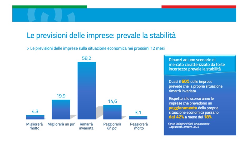 Il quadro internazionale è decisamente complesso ma per un quarto delle imprese italiane gli affari cresceranno nel 2024 mentre per la maggior parte rimarranno stabili. E' quanto rivela un sondaggio Ipsos-Unioncamere-Tagliacarne, che fa il punto su criticità e sfide con cui si deve confrontare il sistema produttivo nazionale.