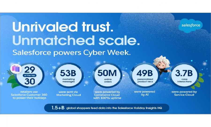 Salesforce ha svolto un ruolo fondamentale nel supportare i retailer di tutto il mondo durante la Cyber Week, garantendo un uptime del 100% e offrendo esperienze digitali veloci, facili e personalizzate attraverso Commerce Cloud, Marketing Cloud e Service Cloud.