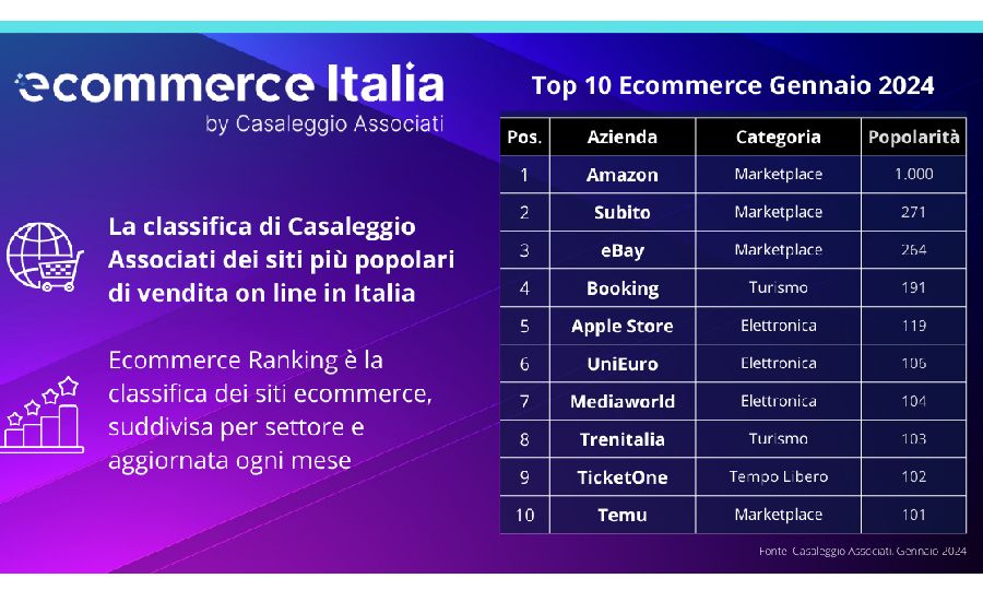 La classifica completa, aggiornata a Gennaio 2024, è consultabile nella sezione Classifica di eCommerce Italia: www.ecommerceitalia.info/e-commerce-ranking.