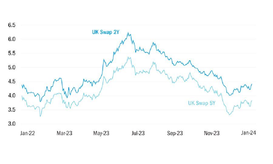 Il risultato è stato un forte aumento delle aspettative sui tassi di interesse. Ciò è particolarmente evidente e rilevante nel Regno Unito, dove i tassi SWAP a 2 e 5 anni, che influenzano i tassi ipotecari, sono aumentati rispettivamente di 50 e 40 punti base dai minimi raggiunti poco prima di Natale. A dire il vero, come si può vedere dal grafico, erano scesi di molto di più dal loro picco dello scorso luglio. Ciononostante, è probabile che alcuni istituti di credito ritirino le offerte a basso tasso ipotecario presentate recentemente, mentre i detentori di depositi cercheranno di migliorare i tassi delle loro obbligazioni a tasso fisso.