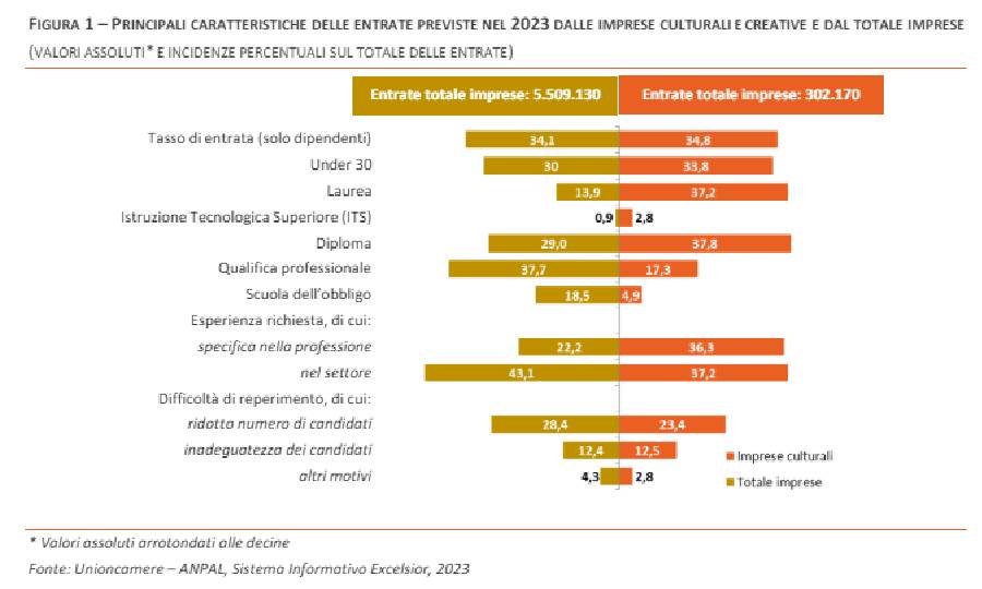 Le imprese culturali e creative sono alla ricerca di profili altamente qualificati, capaci di combinare conoscenze specializzate con talento e creatività. Il 37,2% delle assunzioni ha coinvolto lavoratori laureati, una quota significativamente superiore alla media dell'economia complessiva (13,9%). Inoltre, c'è stata una forte richiesta di esperienza specifica nella professione (36,3% delle assunzioni) e di figure diplomate (37,8% delle assunzioni).