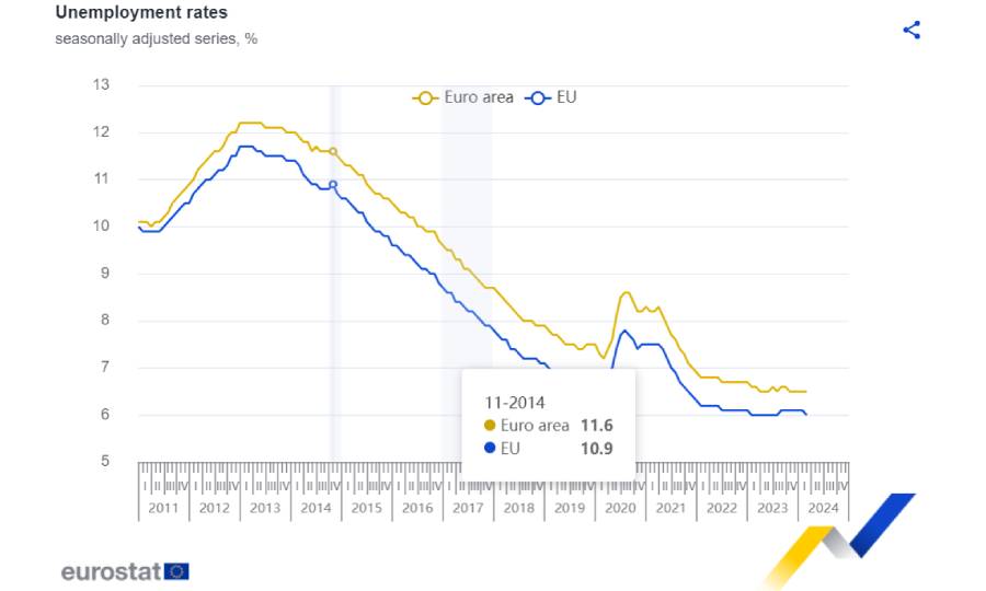 Il tasso di disoccupazione nell'area dell'euro è rimasto stabile, passando dal 6,6% di marzo 2023 al 6,5% di marzo 2024. Anche il tasso di disoccupazione dell'Unione Europea è sceso leggermente, passando dal 6,1% di febbraio 2024 al 6,0% di marzo 2024. Questi dati sono stati resi noti da Eurostat, l'ufficio statistico dell'Unione Europea.