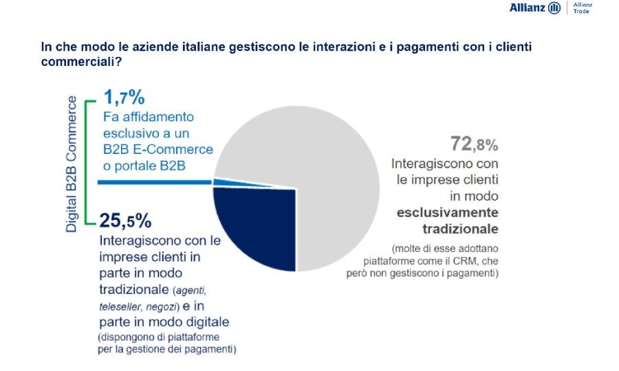 Secondo l'indagine "Piattaforme digitali e commercio B2B: Impatti e tendenze nel mercato italiano", realizzata da Allianz Trade in collaborazione con Format Research su un campione di 899 imprese, la digitalizzazione sta rivoluzionando il panorama B2B italiano. Le aziende che sfruttano piattaforme digitali complete per la vendita B2B sono principalmente di medie e grandi dimensioni, concentrate nel Nord Est (33% degli utilizzatori) e nel Mezzogiorno (31%). I settori più interessati sono chimica (41%), IT (38%), industria alimentare (35%) e sistema casa (33%). In media, un terzo dei loro ricavi proviene da transazioni online.